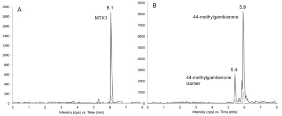 LC-MS/MS Chromatograms acquired in negative MRM mode (system B) of (A) MTX1 standard solution at a concentration of 500 ng mL−1 (Wako, Japan) and (B) 44-methyl gambierone at 5.93 min and the new isomer at 5.42 min in Coolia tropicalis extract.