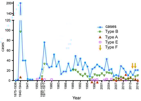 Chicago/Turabian StyleRasetti-Escargueil, Christine, Emmanuel Lemichez, and Michel R. Popoff. 2020. "Human Botulism in France, 1875–2016" Toxins 12, no. 5: 338. https://doi.org/10.3390/toxins12050338