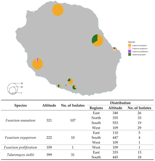 The genus Fusarium represented 79% of the isolates, and the genus Talaromyces accounted for 21% of the isolates. Fusarium isolates were collected from fruits grown at an average altitude of 310 m, while Talaromyces isolates were collected from fruits grown at an average altitude of 399 m. Figure 2 shows the distribution of locations in Reunion Island from which fungi were isolated. The Fusarium isolates were found in all production areas, as shown on the map. The Talaromyces isolates were found in the eastern and southern regions, which are also the rainiest parts of the island.