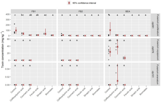 Amounts of fumonisins (FB1 and FB2) and beauvericin (BEA) produced in PJA medium with the addition of the different compounds (0.5 g L⁻1), as indicated, for the growth of different isolates of Fusarium proliferatum, F. oxysporum, and F. ananatum. Different letters indicate that data are significantly different at p < 0.05 between compounds (according to Tukey’s multiple comparison test). A gray colored dot is assigned to each measurement, with darker regions indicating overlap.