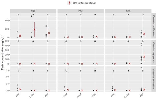 Amounts of fumonisins (FB1 and FB2) and beauvericin (BEA) produced in different media (fructose yeast malt (FYM), glucose yeast asparagine malic acid (GYAM), and potato dextrose agar (PDA)) for different isolates of Fusarium proliferatum, F. oxysporum, and F. ananatum. Different letters indicate that data are significantly different at p < 0.05 between media (according to Tukey’s multiple comparison test). A gray colored dot is assigned to each measurement, with darker regions indicating overlap.