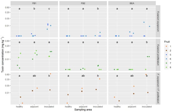 Amounts of fumonisins (FB1 and FB2) and beauvericin (BEA) produced in the healthy, adjacent, and inoculated fruitlets of pineapple fruits artificially infected with Fusarium oxysporum (clp076), Fusarium proliferatum (clp081), and a mixture of F. oxysporum and F. proliferatum (clp105/clp081). Different letters indicate that data are significantly different at p < 0.05 between sampled areas (according to Tukey’s multiple comparison test). The different colors of the shapes correspond to a different pineapple fruit.