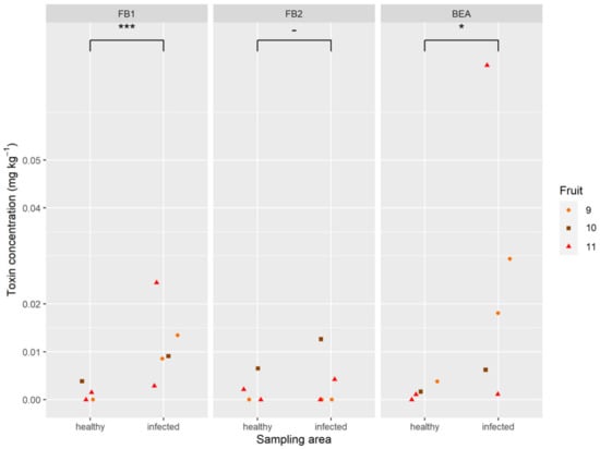 Amounts of fumonisins (FB1 and FB2) and beauvericin (BEA) produced in healthy and naturally infected fruitlets of pineapple. Differences between sampled areas were either significant at p < 0.05 (*), P < 0.001 (***), or nonsignificant (-). The different colors of the shapes correspond to a different pineapple fruit.
