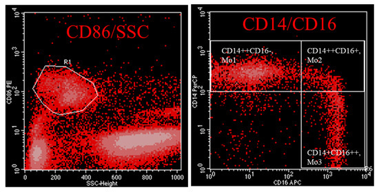 Flow cytometry panel showing gating strategy of monocytes of an uremic patient by anti-CD86 staining and subdivision of monocytes in classical (Mo1), intermediate (Mo2) and non-classical Mo3 according anti-CD14/CD16 staining. R1 includes CD86+ monocytes.