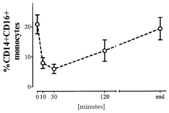 Nowadays, granulocyte sequestration no longer occurs since the membranes are much more biocompatible. Nevertheless, there is still some sequestration of monocytes [5], in particular the proinflammatory populations [104]. Obviously, the Mo2 and Mo3 cell populations are much more likely to be removed from circulation during dialysis [64,105] than Mo1 cells. This effect has been suggested as a measure of dialyzer membrane biocompatibility [106]. As a consequence of sequestration, the cells that remain in the circulation during dialysis produce less cytokines compared to cells from blood samples drawn before a dialysis session [107]. The Mo3 cells reach a nadir at about 15–30 min of a dialysis session and return to predialysis numbers until the end of treatment at 4–5 h (Figure 2) [105]. It is not known whether sequestered cells are released from the endothelium or new cells are spilled out of reservoirs such as the spleen. This sequestration effect has to be considered in all studies that follow cellular or cytokine parameters during a dialysis treatment.