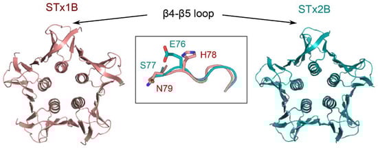Crystal structures of STxB/STx1B and STx2B (Protein Data Bank (PDB): 1R4Q and 1R4P, respectively) with their β4–β5 loops.