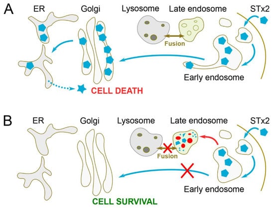 Retrograde transport of Shiga toxin (STx), STx1, and STx2. (A) Direct early endosome-to-Golgi transport allows the toxins to evade degradation in late endosomes. (B) When early endosome-to-Golgi transport is inhibited, the toxins are routed to, and degraded in, late endosomes. ER, endoplasmic reticulum.