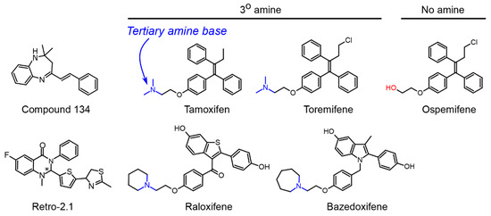 Tamoxifen is a selective estrogen receptor modulator that antagonizes the effects of estrogen and is, therefore, used for breast cancer therapy [81]. However, as described in Selyunin et al. [20], a less appreciated feature of tamoxifen is that it is a lysosomotropic weak base that accumulates within acidic endolysosomes and directly increases compartment pH [82,83]. The capability of tamoxifen to change endolysosomal pH is independent of estrogen receptors and, instead, depends on a tertiary amine in its structure that makes it a weak base (Figure 5) [82,83]. Based on this, Selyunin et al. hypothesized that activity of tamoxifen against STx1/STx2 depended on its tertiary amine base, and not estrogen signaling [20]. Notably, the cell-based assays described above [20] were performed in HeLa cells, which do not express estrogen receptors [84], indicating that the protective effect of tamoxifen against STx2 is independent of estrogen receptor modulation [20]. Furthermore, three clinically approved tamoxifen derivatives with the tertiary amine base, toremifene, raloxifene, and bazedoxifene, provide as much protection as tamoxifen against STx2, but ospemifene, which does not have an amine group and is not a weak base, fails to protect all together (all compounds used at 10 µM) (Figure 5) [20]. The results, in totality, imply that tamoxifen exerts its protective effect against STx1/STx2 by acting as a weak base that directly increases endolysosomal pH, and not by acting as a selective estrogen receptor modulator [20]. As tamoxifen, toremifene, raloxifene, and bazedoxifene are already approved for human use, it may be feasible to translate their protective activity against STx1/STx2 in experimental systems to human therapy more rapidly than other drugs in development [20].