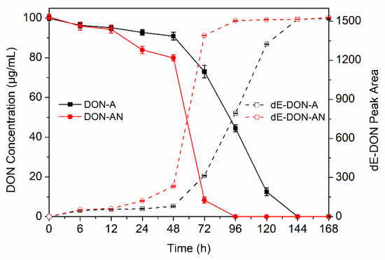 De-epoxidation of deoxynivalenol (DON) by the soil bacterial consortium PGC-3 under aerobic and anaerobic conditions. DON depletion results and the new metabolite accumulation patterns were obtained in MMYPF media containing PGC-3 supplemented with 100 μg/mL DON from 0–168 h under aerobic and anaerobic conditions, in which DON concentration and peak areas for metabolites were measured by high performance liquid chromatography (HPLC) at predetermined time points. Solid lines indicate DON concentrations while dashed lines indicate de-epoxy DON (dE-DON) peak areas. “A” indicates that the consortium culture and DON de-epoxidation activity were analyzed under aerobic conditions; “AN” indicates that the consortium culture and DON de-epoxidation activity were analyzed under anaerobic conditions. The presented values are the means of three biological replicates, while error bars represent standard deviations.