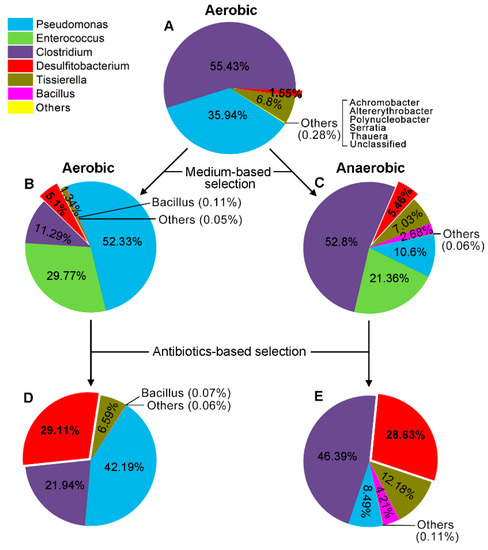 Bacterial population dynamics of the consortium PGC-3 in response to medium and antibiotics under aerobic and anaerobic conditions. Different colors in each pie chart reflect the bacterial distributions at the genus level within the PGC-3 consortium, incubated under conditions based on Operational Taxonomic Units (OTUs). The relative abundance is presented in terms of percentage of total effective bacterial sequences per sample. (A) PGC-3 was incubated in an MSB medium with 100 μg/mL DON under aerobic conditions. (B) PGC-3 was incubated in an MMYPF medium with 100 μg/mL DON under aerobic conditions. (C) PGC-3 was incubated as in B under anaerobic conditions. (D) PGC-3 was incubated as in B supplemented with the antibiotics trimethoprim (100 μg/mL) and sulfadiazine (100 μg/mL). (E) PGC-3 was incubated as in C and supplemented with the antibiotics trimethoprim (100 μg/mL) and sulfadiazine (100 μg/mL).