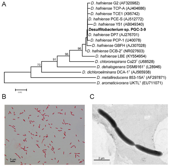 The phylogenetic tree and morphology of the Desulfitobacterium strain PGC-3-9. (A) Phylogenetic tree based on partial 16S rRNA sequence of Desulfitobacterium strain PGC-3-9 and related microorganisms. The 5′ end of the gene that includes the 100–200 nt insertion was excluded. The tree was generated using the neighbor-joining method with 1000 bootstraps. The GenBank accession numbers of the sequences are shown in parentheses. The bar indicates 0.002 substitutions per nucleotide position. (B) Micrograph of Desulfitobacterium strain PGC-3-9 after Gram-staining under the light microscope. (C) Transmission electron micrograph of the Desulfitobacterium strain PGC-3-9 grown in an MMYPF medium.
