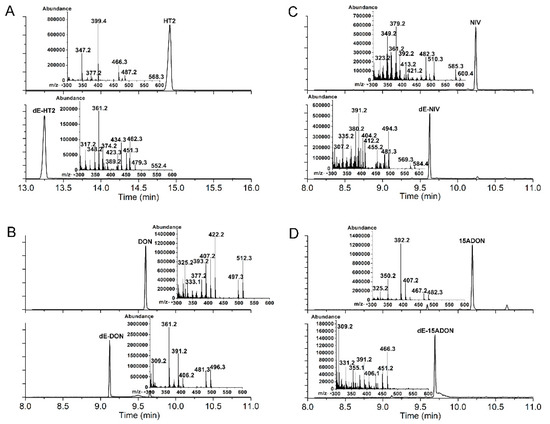 To determine the ability of the Desulfitobacterium sp. PGC-3-9 to de-epoxidate mycotoxins, three type A trichothecene mycotoxins (T2, HT2, and NEO) and five type B trichothecene mycotoxins (DON, NIV, 15ADON, 3ADON, and FUS) were tested under anaerobic conditions. After 24 h of incubation, the trichothecenes and their de-epoxidated products were examined by gas chromatography-mass spectrometry (GC-MS). The trichothecenes in media omitting the PGC-3-9 were extracted and used as controls (Figure 4, upper panel). The results showed that the strain PGC-3-9 completely de-epoxidated HT-2 to produce de-epoxy HT2 (dE-HT2) (Figure 4A, Table 2). GC-MS revealed different retention times for HT2 (14.79 min) and dE-HT2 (13.25 min) as well as different molecular masses in mass spectra (HT2: 568.3, the upper panel in Figure 4A; dE-HT2: 552.4, the lower panel in Figure 4A), since the mass of de-epoxidated trichothecene mycotoxins (such as dE-HT2) is 16 daltons less than the parental trichothecenes due to the loss of one oxygen atom following de-epoxidation (Table 2). However, T2 and NEO were not de-epoxidated by this strain (Figure S1). As for the five type B trichothecene mycotoxins, the strain PGC-3-9 completely de-epoxidated three of them: DON into dE-DON, NIV into dE-NIV, and 15ADON into dE-15ADON. GC-MS revealed different retention times and molecular masses between DON and dE-DON, NIV and dE-NIV, and 15ADON and dE-15ADON (Figure 4B–D; Table 2). These results demonstrated that the Desulfitobacterium sp. strain PGC-3-9 was able to completely de-epoxidate different types of trichothecene mycotoxins to nontoxic de-epoxy forms.
