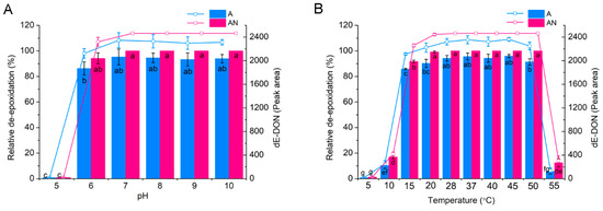 The effects of culture conditions on DON de-epoxidation by the Desulfitobacterium strain PGC-3-9. (A) Effects of pH experiments performed in an MMYPF medium under aerobic (A) and anaerobic (AN) conditions at 37 °C. (B) Effects of temperature; experiments were performed in an MMYPF medium under aerobic (A) and anaerobic (AN) conditions at pH 7. Strain PGC-3-9 cells at OD600 = 2 were inoculated with DON at 500 μg/mL, DON reduction and its catabolized product were determined at 24 h after inoculation. All experiments were biologically replicated three times. The error bars represent the standard deviations.