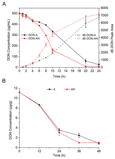De-epoxidation rates of DON in medium and in wheat grains by the Desulfitobacterium strain PGC-3-9 under aerobic and anaerobic conditions. (A) DON depletion and dE-DON accumulation with strain PGC-3-9 during the 24 h after incubation. DON (500 μg/mL) was incubated with PGC3-9 in an MMYPF medium under aerobic and anaerobic conditions, and the concentrations of DON and dE-DON were measured by HPLC. Solid lines indicate DON while dashed lines indicate dE-DON. (B) Degradation of DON in wheat grains by PGC-3-9 during the 48 h after incubation. Wheat grains were contaminated with DON (11.2 μg/g) in the field. DON concentrations were measured by gas chromatography–mass spectrometry (GC–MS) under aerobic and anaerobic conditions. “A” represents the culture of strain PGC-3-9 and the examination of DON de-epoxidation activity under aerobic conditions. “AN” represents the culture of strain PGC-3-9 and the examination of DON de-epoxidation activity under anaerobic conditions. The presented values are the means of three biological replicates while error bars represent standard deviations.