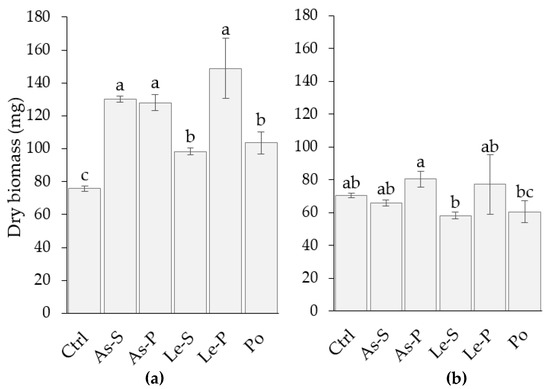 All the quantities of mycelial biomass produced by F. verticillioides strain Fv63 were significantly higher in cultures treated with CEs of A. subrufescens stripe (As-S), A. subrufescens pileus (As-P), L. edodes stipe (Le-S), L. edodes pileus (Le-P), and P. ostreatus sporophore (Po) when compared to the control (Figure 1a). On the other hand, treatment of the MY3 strain of F. verticillioides with these CEs demonstrated no effect on growth compared to the control (Figure 1b).