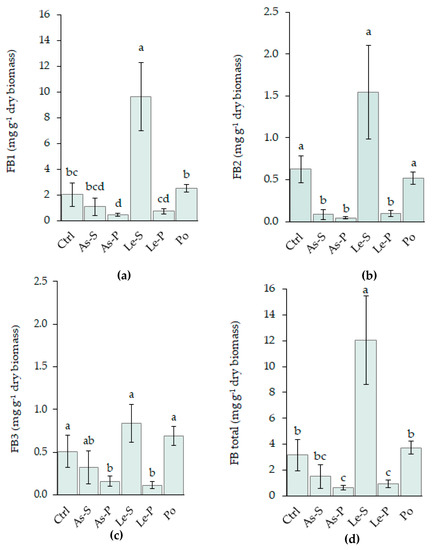 CE from As-P was demonstrated to inhibit the FB1 and FB2 production of the Fv63 strain by 79% and 92% respectively, and demonstrated similar activity against FB3 production (69%) (Figure 2). As-S significantly inhibited FB2 production (86%) and decreased FB1 (46%) and FB3 (36.8%) concentrations. CE from Le-P inhibited the production of the three fumonisins (64.5% for FB1, 84.37% for FB2, and 77.6% for FB3), while CE from Le-S significantly increased their production (Figure 2a–c). FB1 + FB2 + FB3 production was inhibited by As-P and Le-P treatments (80.2% and 70.6%, respectively), whereas Le-S increased their accumulation by 4-fold (Figure 2d).