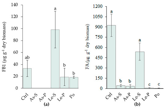 FB1 and FA produced by F. verticillioides (MY3 strain) in glucose, amylopectin, yeast extract, and peptone (GAYEP) medium supplemented with 2 mg mL−1 CEs. (a) FB1 production versus treatment with different CEs, (b) FA production versus treatment with different CEs. Data are represented by the mean of three replicated cultures and three measurements of FB1 or FA production and error bars represent the ± standard deviation. Letters (a, b, and c) indicate significant differences between treatments and the control, according to Tukey’s Test (α = 0.05). Extracts were: Control (Ctrl), CEs from A. subrufescens stipe (As-S) and pileus (As-P), L. edodes stipe (Le-S) and pileus (Le-P), P. ostreatus sporophore (Po).