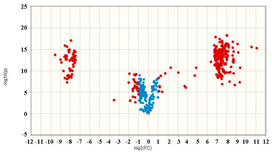 Volcano plot of ions detected in L. edodes CEs. Ions with significantly different abundance (fold change > 2) between the samples (●), ions with no significant difference in abundance between the samples (●).