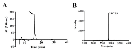 The Lycosa vittata’s cDNA library was constructed in our laboratory. According to the sequence information in the cDNA library and the relevant properties of the anticancer peptides [19,20], we successfully designed and synthesized a linear and amphipathic alpha-helical peptide, which was entitled LVTX-8 (Figure S1A,B). The amino acid sequence of the LVTX-8 is IWLTALKFLGKNLGKHLAKQQLSKL. Using solid-phase peptide synthesis, we successfully prepared the sample of LVTX-8. The synthetic LVTX-8 was purified using C18 Reversed-phase high performance liquid chromatography (RP-HPLC) (Figure 1A). Then, the peak was obtained and analyzed using Matrix-Assisted Laser Desorption/ Ionization Time of Flight Mass Spectrometry (MALDI-TOF MS). The peak for LVTX-8 displayed a molecular mass of 2847.99 Da, which is equal to the calculated value according to the sequences. (Figure 1B). The result indicated that the designed LVTX-8 was successfully synthesized.