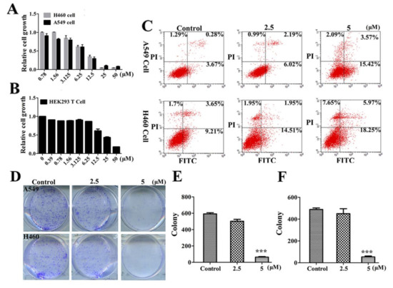The effect of LVTX-8 on cell cytotoxicity and growth. Effect of LVTX-8 on A549, H460 (A) and HEK293T cells (B). The cytotoxic activities were detected by CCK-8 assay after treatment with LVTX-8 for 24 h (C). A549 and H460 cells apoptosis treatment with LVTX-8 was achieved by flow cytometry. Colony formation of A549 and H460 cells treated with LVTX-8 was evaluated (D). The situation of A549 and H460 colony formation with 2.5 μM or 5 μM LVTX-8 treatment. Quantitative results of A549 (E) and H460 (F) colony are illustrated (n = 3).