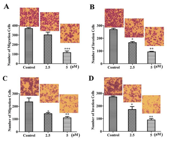 Liner ACPs have been reported to have an inhibitory effect on many cancer cells [21,22]. However, their roles in anti-metastasis are not entirely clear. In order to explore the effect of LVTX-8 on cell migration and invasion, Transwell migration and invasion assay were performed. These results showed that LVTX-8 could significantly inhibit cell migration activity in a dose-dependent manner (Figure 3A,C). Similarly, LVTX-8 could impair cell invasion ability in both cell models in a dose-dependent manner (Figure 3B,D). These results clearly demonstrated that LVTX-8 not only inhibited cancer cell growth, but also possessed an anti-metastasis function in lung cancer cells at a concentration below the IC50.
