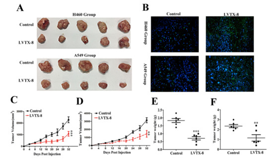 The influence of LVTX-8 on the growth of A549 and H460 in xenograft tumors. (A) Images of the nude mice and their xenograft tumors at 32 d after injection (n = 5). (B) In situ labeling (TUNEL) examination of nude mice tumor tissues. Dynamic volume of xenograft tumors at different times after injection, for A549 xenograft model (C) and H460 xenograft model (D). Weight of xenograft tumors at the 32nd day after injection, A549 (E) and H460 (F).