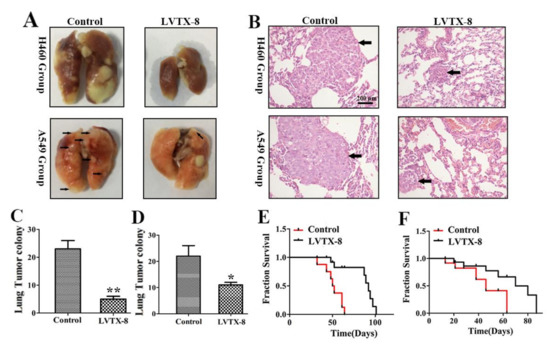 LVTX-8 inhibited metastatic lesion formation. (A) Representative lung imaging of nude mice injected with H460 (upper) and A549 (lower) cells. (B) H&E examination of nude mice lung tissues that received different treatments. Phosphate buffer saline (PBS) (left), LVTX-8 (right). (C,D) Quantification of H460 (left grouping) and A549 (right grouping) lung metastatic colony formation of the lung metastasis in the nude mice model (n = 5). (E,F) The Kaplan–Meier method is used to assess the survival time of animals. The survival times of H460 (left grouping) and A549 (right grouping) mice in the LVTX-8-treated group were significantly longer than those in control group (n = 6).