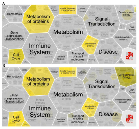 Result of Reactome pathway analysis. (A,B) showed the main biological processes and hierarchical structure of Reactome pathways (p < 0.05) after 2 µM and 5 µM LVTX-8 treatment, respectively.