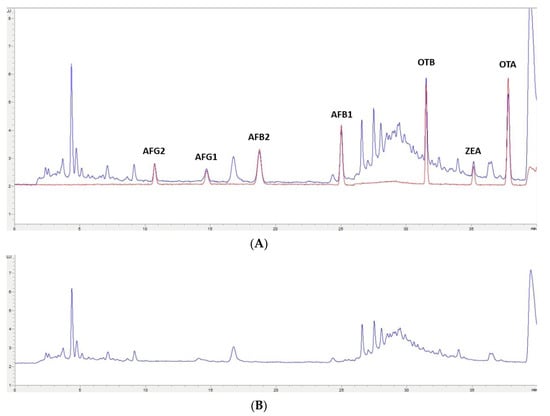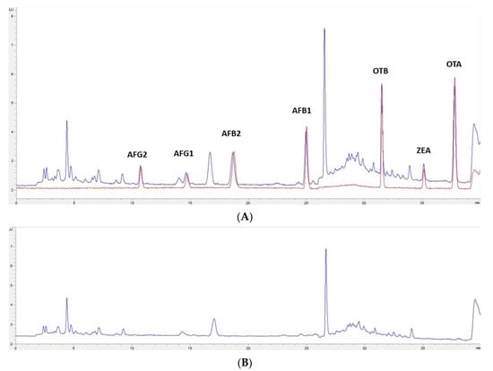 In this study, the extraction of mycotoxins from feed samples was first attempted using a Quick, Easy, Cheap, Effective, Rugged and Safe (QuEChERS) methodology. The first approach involved an extraction using water and a solution of acetonitrile (ACN)/formic acid (99/1) or orthophosphoric acid. NaCl and MgSO4 were then added and after centrifugation, a supernatant containing the extracted mycotoxins could be separated. However, the extract was not clean enough for chromatographic analysis; also, no differences were observed when using formic or orthophosphoric acid. Then, to improve the cleaning-up of the extract, the supernatant was treated with MgSO4 and C18 particles in different proportions, but this process was not successful. Moreover, primary/secondary amine (PSA), alumina, and active carbon were assayed, but very low recovery values (lower than 60% for OTA, OTB, AFG1, and AFG2) were obtained. Finally, QuEChERS was discarded and an OASIS PRIME HLB solid-phase extraction (SPE) (Waters, Milford, MA, USA) cartridge in pass-through mode was used. The eluate obtained went through a second clean-up process based on dispersive liquid–liquid microextraction (DLLME) with chloroform and water. Based on the procedure used by Zhou et al. [29], to achieve multi-detection of mycotoxins in cereals and bean foodstuffs, a new DLLME procedure was developed because some modifications were required to adapt it to feed samples. This procedure of sample treatment gave very clean extracts for each one of the assayed matrixes; also, similar chromatograms have been obtained from each type of non-fortified feed (Figure 2B, Figure 3B, Figure 4B, Figure 5B). These results indicate that this methodology would have a wide applicability for mycotoxin analysis in feed.