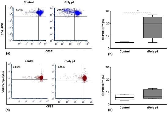 Flow cytometry analysis, using a CFSE probe and labelling with antibodies to specific surface markers, were performed to assess the antigen-specific proliferation of CD4 and CD8 T cell subsets. As demonstrated in Figure 1, we observed a significant expansion of antigen-specific CD4+ T cells (CSFElow) (panels a,b) in the rPoly p 1-sensitized mice in comparison with mice immunized with E. coli protein extract (control group) (17.83 ± 3.04% vs. 4.91 ± 0.12%, p = 0.0293). In contrast, no significant proliferation of antigen-specific CD8 T cells (panels c,d) was detected in comparison with the control (7.80 ± 1.16% vs. 5.76 ± 0.93%, p = 0.3153). These results indicate that rPoly p 1 preferentially induces the expansion of antigen-specific CD4+ T cells.