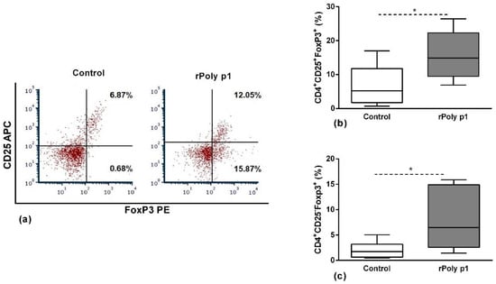 Tregs population frequency after in vitro antigenic stimulation. Cells stained with monoclonal antibodies conjugated to fluorochromes to Tregs markers: CD4, CD25 and FoxP3. Panel (a) presents a representative dot plot showing the frequency (%) of CD4+CD25+FoxP3+ Tregs (upper right quadrant) and CD4+CD25-FoxP3+ Tregs (lower right quadrant), and the boxplots (b) and (c) represent their corresponding data obtained in Control and rPoly p 1 groups. *p < 0.05 Mann–Whitney U test.