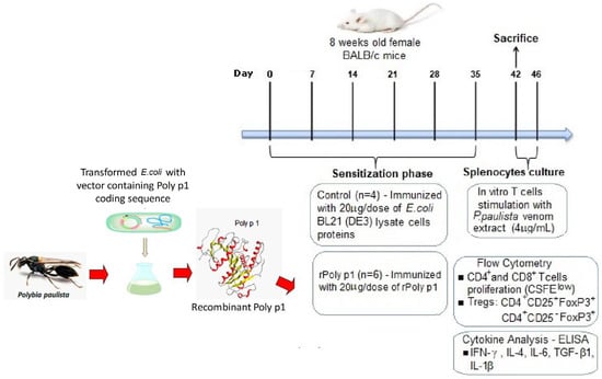 Timeline for sensitization with rPoly p 1 and experimental procedures description. Mice were sensitized to rPoly p 1 by weekly intradermal injections (six doses—20 µg/dose), the control group received a 20 µg/dose of E. coli BL21 (DE3) cells’ lysate proteins. Seven days after the last dose, the mice were sacrificed, and the splenocytes were cultured for 96 hours in the presence of P. paulista venom extract (4 µg/mL) for antigen-specific stimulation of T cells. After this period, the cells were stained for flow cytometry analysis to evaluate the proliferation of T cells and the frequency of regulatory T cells populations. The cell culture supernatants were collected for cytokines quantification by ELISA assays. Polybia paulista photo was kindly provided by Dr. Mario S. Palma. BALB/c mouse photo is from Staton K. Short, The Jackson Laboratory (https://www.jax.org/strain/000651).