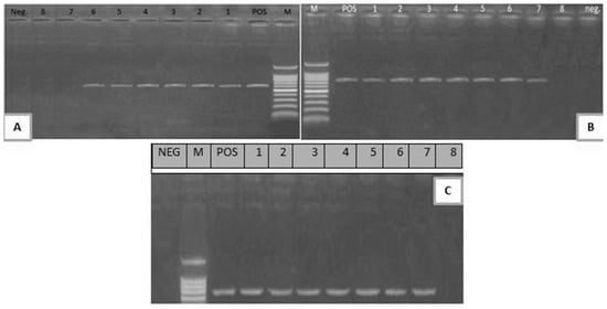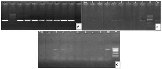 (A) Electrophoretic pattern of aadB (319 bp): M: 100–1000 bp DNA ladder; POS: Positive control; Neg: Negative control; Lanes: 1–8: positive E. coli strains. (B) Electrophoretic pattern of sul1 gene (433 bp): M: 100–1000 bp DNA ladder, POS: Positive control; Neg: Negative control; Lanes: 1, 4, 5: positive E. coli strains; Lanes: 2, 3, 6, 7, 8: negative E. coli strains. (C) Electrophoretic pattern of blaTEM gene (516 bp): M: 100–600 bp DNA ladder; POS: Positive control; Neg: Negative control; Lanes: 2–3: positive E. coli strains; Lanes: 1, 4, 5, 6, 7, 8: negative E. coli strains.