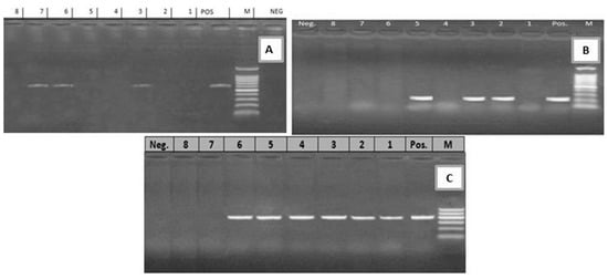 (A) Electrophoretic pattern of stx1 gene (614 bp); M: 100–1000 bp DNA ladder; POS: Positive control; Neg: Negative control; Lanes 1–6: positive E. coli strains; Lanes 7, 8: negative E. coli strains. (B) Electrophoretic pattern of stx2 gene (779 bp); M: 100–1000 bp DNA ladder, POS: Positive control; Neg: Negative control; Lanes 1–7: positive E. coli strains; Lane 8: negative E. coli strain. (C) Electrophoretic pattern of eaeA gene (248 bp): M: 100–600 bp DNA ladder; POS: Positive control; NEG: Negative control; 1–7: positive E. coli strains; Lane 8: negative E. coli strain.