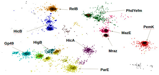 The figure illustrates the high sequence identity between proteins grouped into one family of toxin or antitoxin (Table 1). Some of the protein families such as Mraz and MazE are situated close to each other due to their high sequence similarity. The clusterization of proteins of the TA system according to the selected domains revealed the uniqueness of protein families as well as the differences between them.