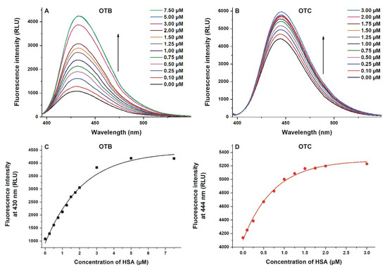 (I) First, 365 (OTB) and 380 nm (OTC) excitation wavelengths were used to test the effect of HSA on the intrinsic fluorescence of ochratoxins. Emission signals of both OTB and OTC significantly increased with the elevation of HSA concentration (Figure 3), and the relative increase in the fluorescence of OTB was larger compared to OTC. Importantly, under the applied circumstances, HSA did not show emission signal. These observations suggest again the formation of ochratoxin–albumin complexes. Because the fluorescence of aromatic fluorophores can be partly quenched by water molecules [32], the binding of OTB and OTC to HSA results in the partial decomposition of their hydration shell. Consequently, the quenching effect of water molecules decreases and the emission signal of the mycotoxins rises [18,20,23]. In the presence of HSA, a slight red shift (430 → 435 nm) was observed in the emission wavelength maximum of OTB, as was also reported by Perry et al. [22]. HSA caused a similar shift in the emission spectrum of OTC (444 → 447 nm). As it is demonstrated in Figure 3C,D, lower HSA concentrations were enough to achieve the complete albumin binding of OTC vs. OTB (approximately 2–3 vs. 5–7 μM, respectively), suggesting that HSA forms more stable complexes with OTC.