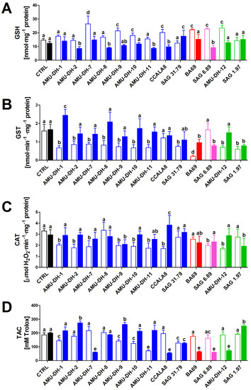 The TAC of hepatocytes displayed different responses to cyanobacterial extracts depending on the strain and stage of development. In extracts obtained from some of the A. gracile strains (AMU-DH-1, AMU-DH-9, AMU-DH-10, AMU-DH-11, and SAG 31.79), a decrease in the level of this parameter was observed. A similar effect was produced by the following extracts from the older cultures: A. gracile AMU-DH-7 and SAG 31.79, Aphanizomenon sp. BA 69, P. agardhii SAG 6.89, and R. raciborskii AMU-DH-12 (Figure 1).