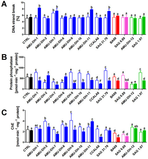 The effect (mean ± SD) of cyanobacterial extracts obtained from the 25- and 70-day-old cultures (open and filled bars, respectively) on DNA fragmentation (A) and serine/threonine protein phosphatase activity (B) in hepatocytes isolated from common carp, and cholinesterase activity in the brain homogenate (C) (n = 8). CTRL—control (cells/brain homogenate exposed to pure WC medium). Blue bars—A. gracile strains; red bars—Aphanizomenon sp. from the Baltic Sea; pink bars—P. agardhii; green bars—R. raciborskii strains. Different lowercase letters (a–g) above the bars indicate statistically significant difference between groups revealed by post hoc tests for pairwise comparisons (p < 0.05).