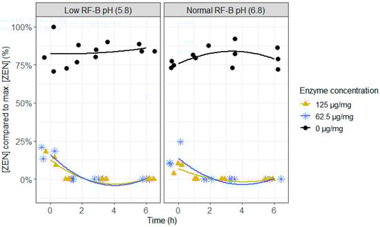 - An additional experiment with ZenA was performed to test the activity of the enzyme at different pH levels. Hence, the enzyme was added to the rumen fluid–buffer mixture at two different pH levels just before incubation: low pH (5.8 [18]) and normal pH (6.8).