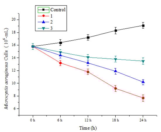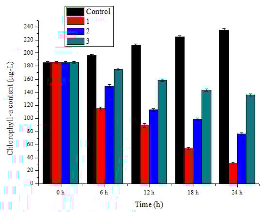 Algicidal efficiency of M. aeruginosa treated by Ph. chrysosporium. 1—presents the content of chlorophyll-a in the culture of M. aeruginosa with Ph. chrysosporium liquid which contained metabolites of Ph. chrysosporium; 2—presents content of chlorophyll-a in a M. aeruginosa culture Ph. chrysosporium supernatant; 3—presents content of chlorophyll-a in a M. aeruginosa culture with Ph. chrysosporium inactivated by high temperature. M. aeruginosa Data are expressed as mean ± SD (n = 3).