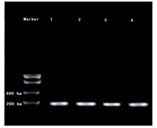 The PCR amplification electrophoregram of 16S rRNA, 1 represented the sample was M. aeruginosa cultured without Ph. chrysosporium, and 2—presents the Ph. chrysosporium liquid which contained metabolites of Ph. chrysosporium; 3—presents the M. aeruginosa culture Ph. chrysosporium supernatant; 4—presents the M. aeruginosa culture with Ph. chrysosporium inactivated by high temperature.
