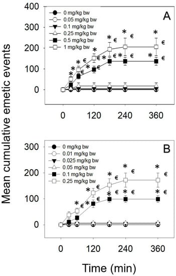 Mean cumulative emetic events in mink, following (A) IP and (B) oral exposure to DAS. Data represent mean ± SEM (n = 5/group). Two-way ANOVA using the Holm–Sidak method was used to assess significant differences in mean cumulative emetic events, as compared with the control. Symbols: * indicates a statistically significant difference in cumulative emetic episodes compared with the control (p < 0.05) and € indicates a statistically significant difference relative to the 0-min time point within a given dose (p < 0.05).