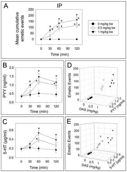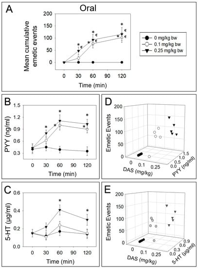 DAS-induced (A) emetic effect corresponds to the elevation of plasma PYY (B,D) and 5-HT (C,E) following oral exposure in mink. Experiment was carried out and data were assessed as depicted in Figure 2 legend.