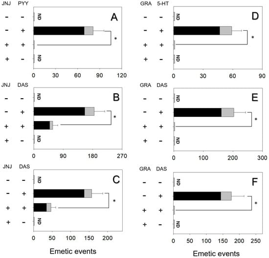 NPY2 receptor inhibitor JNJ-31020028 diminished emetic episodes induced by (A) PYY, (B) DAS following IP exposure, (C) DAS following oral exposure. Serotonin 3 receptor inhibitor granisetron abolished emetic episodes induced by (D) 5-HT, (E) DAS following IP exposure, (F) DAS following oral exposure. Emetic response comprises retching (black) and vomiting (gray) episodes. ND = not detected. Data represent mean ± SEM (n = 5/group). A one-way ANOVA using Holm–Sidak was used to assess significant differences between treatments and the respective controls. Symbols: * indicates statistically significant differences in emetic episodes (p < 0.05).