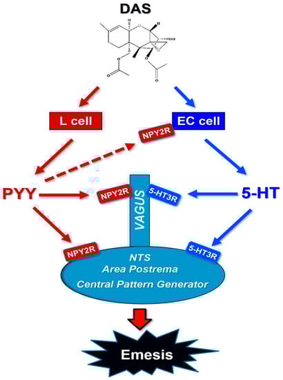 This is the first study to investigate the roles of neurotransmitters; peptide YY (PYY) and 5-HT; as well as their receptors (NPY2R and 5-HT3R), in mediating emetic response induced by intraperitoneal injection (IP) and orally dosing with diacetoxyscirpenol (DAS).