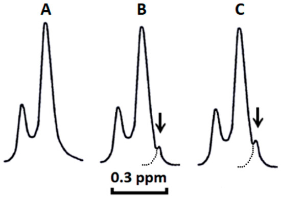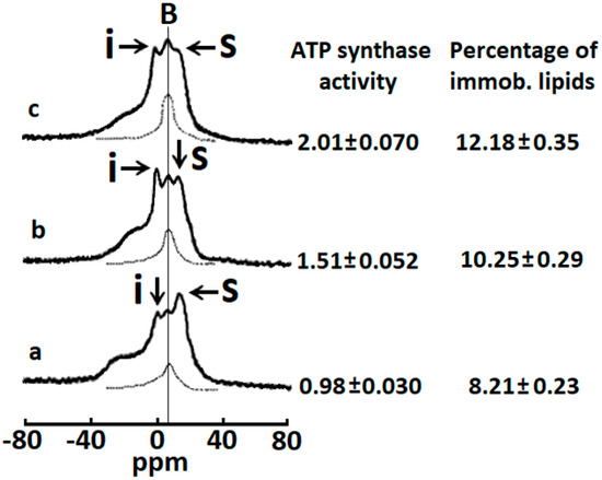 An asymmetrically shaped peak located at the high-field side of the spectrum at a resonance frequency of 11.9 ppm is presumably generated by phosphodiester bonds of phospholipids found in a lamellar phase [1,3,4,5,7,8]. A relatively narrow peak observed with a resonance frequency at 0.0 ppm (Figure 1a, under the arrow shown in letter (i) in the line shape) is a biophysical characteristic of non-bilayer structures that contain packed phospholipids of rapid isotropic mobility [1,3,4,5,7,8]. In Figure 1, a vertical line is drawn through a broad peak B at the resonance frequency 6.5 ppm. This broad peak signal B is derived from the non-bilayer immobilized phospholipids which presumably interact directly with the F0 subunit of ATP synthase and play an important role in facilitating ATP synthase activity [1,3,4,5]. Overall, per our previously published studies, we believe that this 31P-NMR spectrum line shape represents mitochondria containing intact phospholipid membranes (OMM and IMM) under physiological conditions [1,3,4,5].