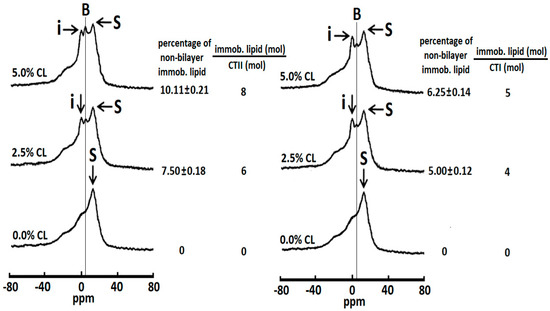 Percentage of immobilized PC molecules and immobilized PC over CTI or CTII molar ratio in sonicated liposomes of pure PC, PC + 2.5% mol CL and PC + 5.0% mol CL. The amount of non-bilayer immobilized PC molecules was estimated by calculating the computer-extrapolated area under the high-field peak on the shoulder of the N+(CH3)3 1H-NMR signal from PC molecules on the outer leaflet of liposomes (see Figure 3). The percentage numbers of non-bilayer immobilized PC molecules are means with standard errors (± SEM) compiled from three independent experiments. Statistical differences were observed between pure PC liposomes vs. liposomes with 2.5% mol CL or 5% mol CL (one-way ANOVA, Fisher’s LSD).