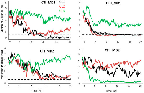 Evolution analysis of the CTI (two molecular dynamics (MD) simulations shown on left panels top and bottom) and CTII (two MD simulations shown on right panels top and bottom) interactions with the 3 cardiolipin (CL) molecules present in the bilayer. The dashed line indicates the minimum distance (0.5 nm) required for an intermolecular interaction. Note that in three of the four systems, the cardiotoxin is able to interact with at least one or two CLs within 10 ns for CTI and 4 ns for CTII and remain associated for the rest of the simulation period.