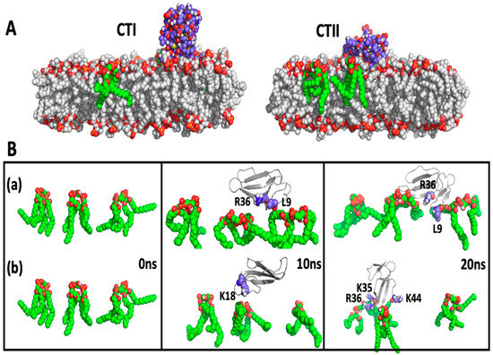 Figure 9 and Figure 10 demonstrate a vertical orientation of CTI in biding the surface of a phospholipid membrane consisting of PC + CL with the second and third loops initially immersed into the polar membrane region as suggested by the MD simulation studies (Figure 5(Bb) at 20 ns). K18 along with K35, R36 and C38 in CTI were identified as the key amino acid residues that bind to CL which is consistent with our MD simulations. K35, R36 and C38 in CTI were identified as the key amino acid residues that bind to PC. In addition, K2, K5, K12 and K44 are exposed away from the molecular surface of CTI, suggesting that these amino acid residues may mediate long-distance electrostatic interactions with the anionic polar heads from phospholipids in neighboring membranes [19] to promote the surrounding of the CTI molecular surface with the polar heads of phospholipids.