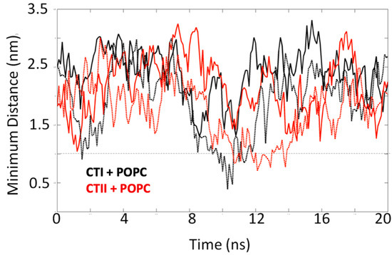 Evolution analysis of the interaction of CTI (black lines) and CTII (red lines) with simulated membranes composed exclusively of POPC for two simulations for each cardiotoxin. Note that both cardiotoxins are unable to significantly interact (come within 0.5 nm) with the POPC membranes within 20 ns.